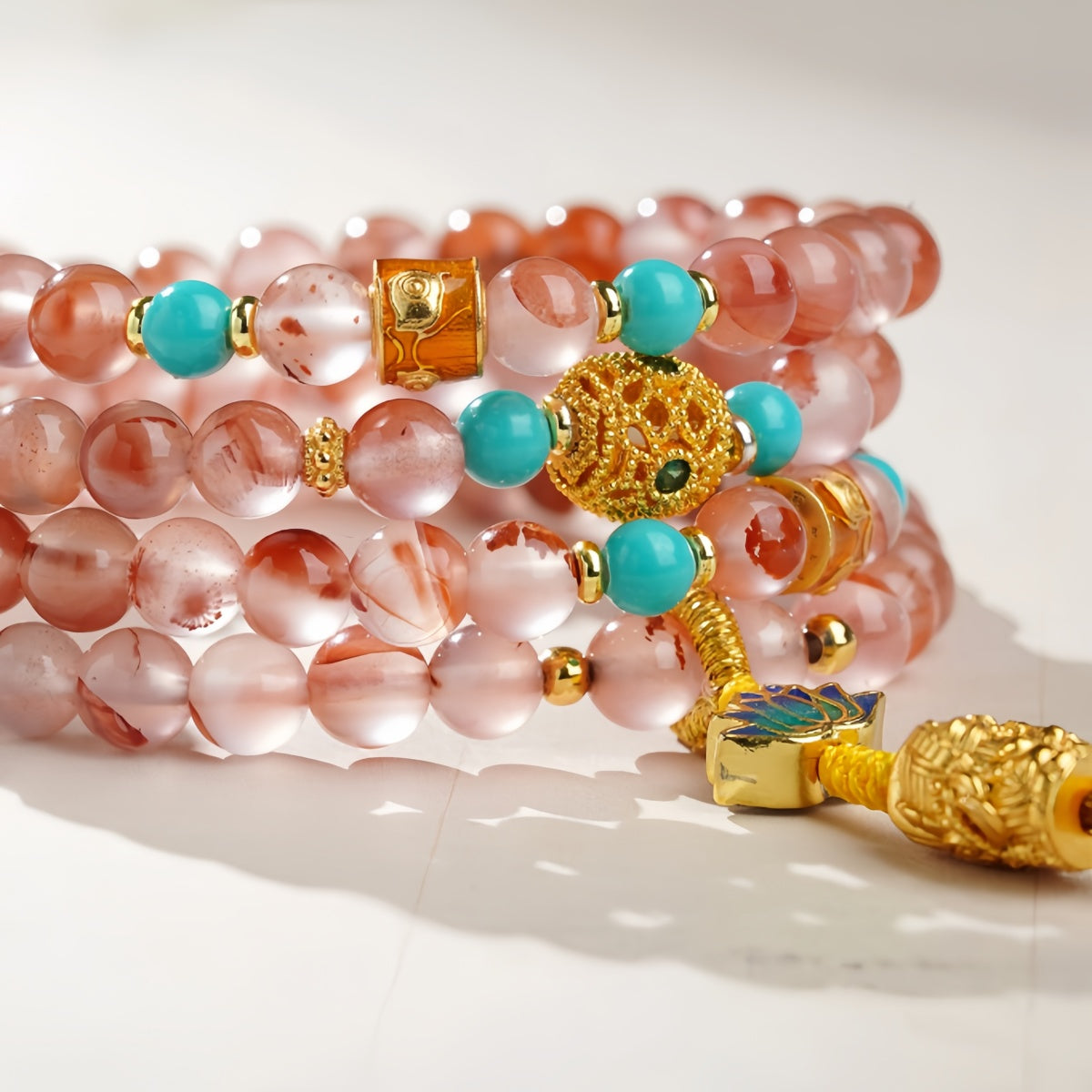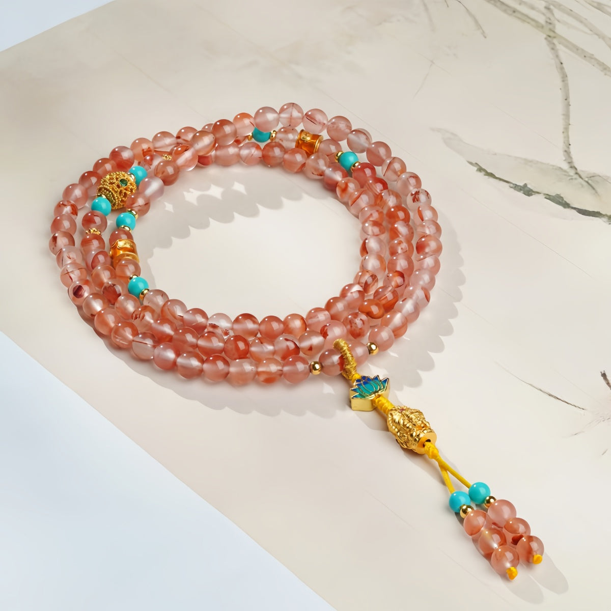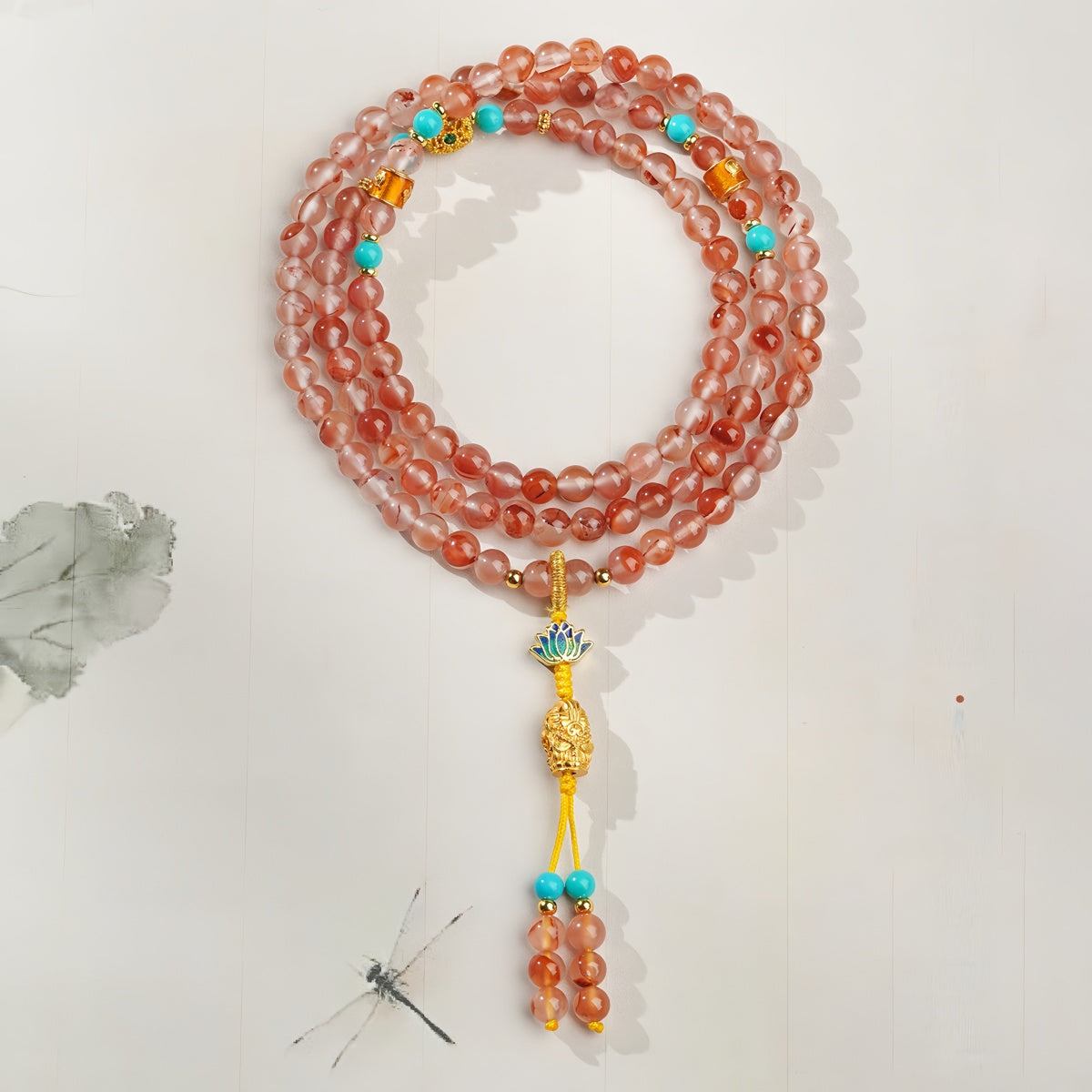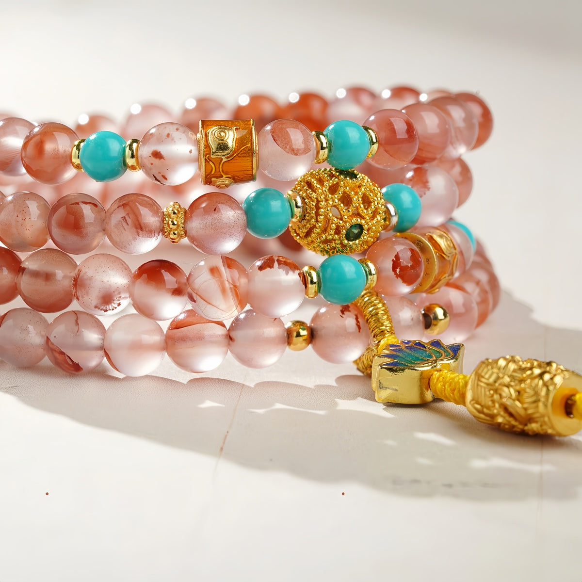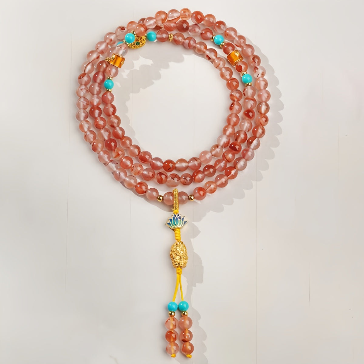 这款手工制作的藏式手链蕴含着古老的智慧,旨在为您带来精神上的庇佑和好运。手链由精心制作的珠子串成,每颗珠子都饰有独特而精美的红白图案,象征着和谐、平衡和积极的能量。